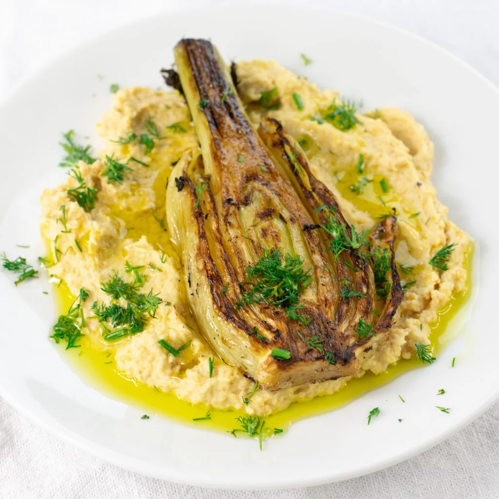 For the purée I sautéd 1 leek chopped small with 1/2 a fennel bulb also chopped small, in 1 tablespoon ghee. Once soft add 1/4 to 1/2 cup water — depends how big your leek and fennel were — 1/2 teaspoon freshly ground cardamon, 1/4 teaspoon freshly ground black pepper, pinch of rock salt. Cook this for a few minutes — you only want it moist not lots of liquid — then blitz with 2 tablespoons of creme fraiche.
